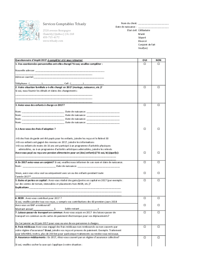 Services Comp tables Totally 2520 avenue Burgoyne Chamber (Quebec) J3L 2A8 4507154172 www.tchasly.comNom Du client: ___ Date de Renaissance : ___ that civil: Clibataire Mari Spar Divorce Conjoint