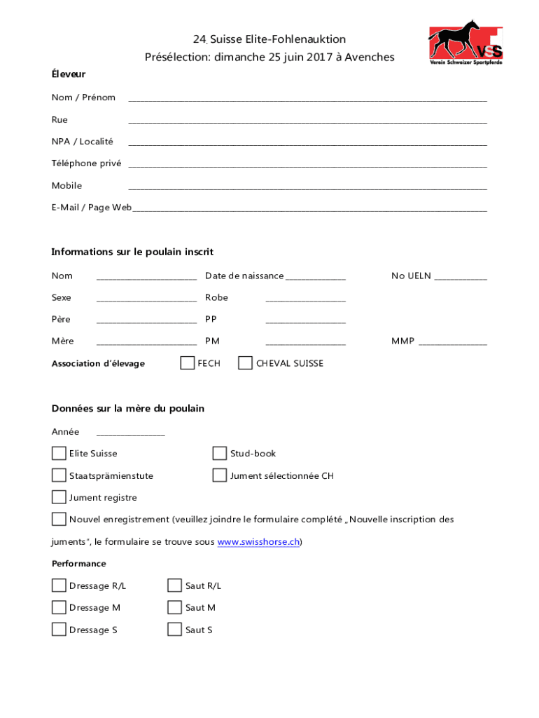 24. Swiss EliteFohlenauktion Protection: Comanche 25 join 2017 Agencies lever Not / Prom___Rue___NPA / Locality___Tl phone PRI ___ Mobile___Email / Page Web ___Information SUR LE plain inherit Not___