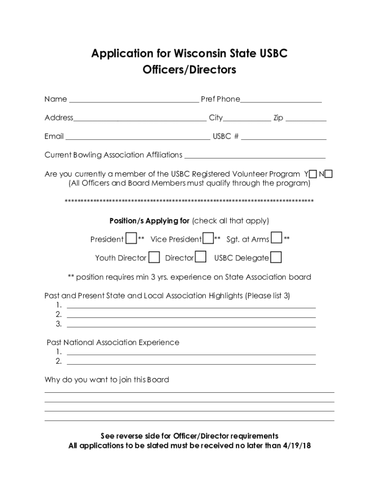 Application for Wisconsin State USB Officers/Directors Name ___ Pref Phone___ Address___ City___ Zip ___ Email ___ USB # ___ Current Bowling Association Affiliations ___ Are you currently a member