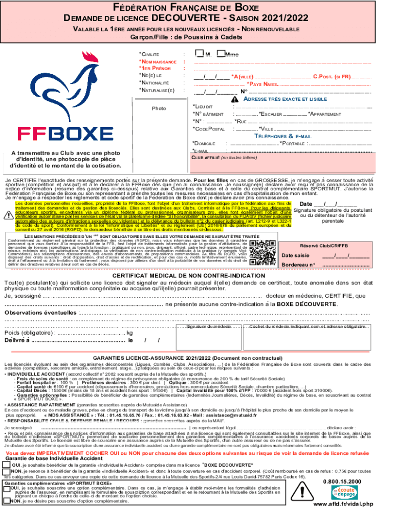 Fdration f boxe demande can be filled out by providing personal information, boxing experience, and any relevant medical history.