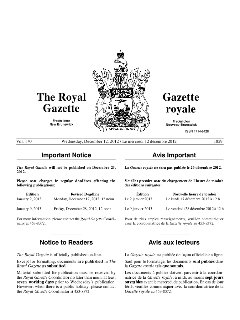 The Royal GazetteGazette royaleFredericton New Brunswick Fredericton NouveauBrunswick ISSN 17149428Vol. 170Wednesday, December 12, 2012 / Le Merced 12 December 20121829Important Notice Avis Important
