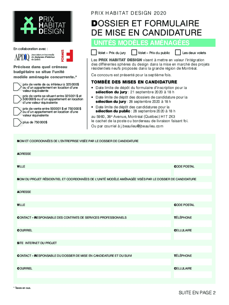 PRI X HA B I T A T DE S I G N 2 0 2 0DOSSIER ET FORMULA IRE DE MILE EN CANDIDATURE En collaboration Alec :UNITS MODES IMAGES Violet PRI Du juryPrcisez days fuel cream budgetary SE site unit model