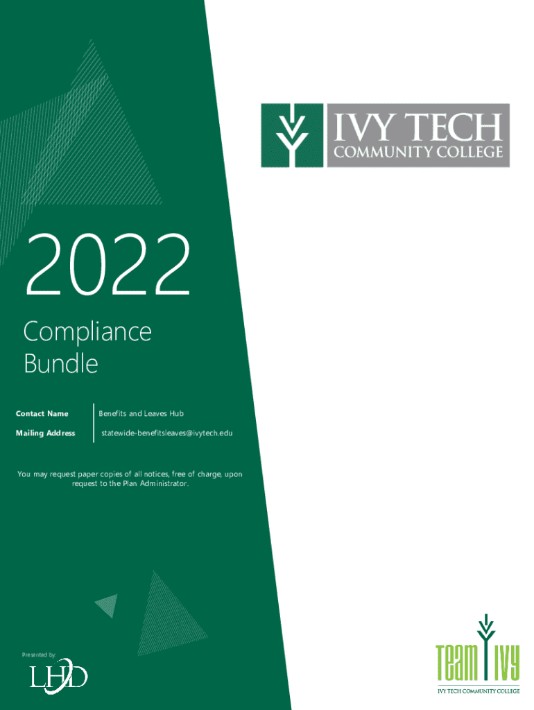 2022 Compliance Bundle Contact NameBenefits and Leaves Hobnailing Addressstatewidebenefitsleaves@ivytech.eduYou may request paper copies of all notices, free of charge, upon request to the Plan Administrator.