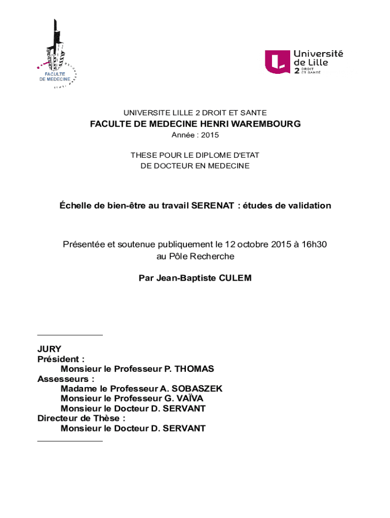 UNIVERSITY LILLE 2 DROID ET SANTEFACULTE DE MEDICINE HENRI LUXEMBOURG Anne : 2015 THESE POUR LE DIPLOMA D\'ETA TDE DOCTOR EN MEDECINEchelle de painter AU travail SERENA : tubes de validationPrsente