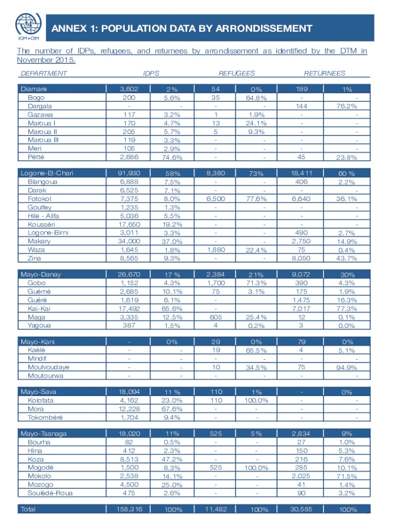 ANNEX 1: POPULATION DATA BY Arrondissement number of IDPs, refugees, and returnees by arrondissement as identified by the DTM in November 2015.DEPARTMENTDiamareBogoDargalaGazawaMaroua Improve Timorous