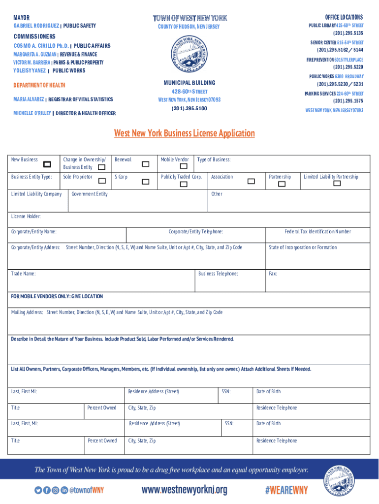 OFFICE LOCATIONSTOWN OF WEST NEW YORKMAYORGABRIEL RODRIGUEZ | PUBLIC SAFETYPUBLIC LIBRARY 42560th STREET (201).295.5135COUNTY OF HUDSON, NEW JERSEYCOMMISSIONERSSENIOR CENTER 51554th STREET (201).295.5162/5144COSMO