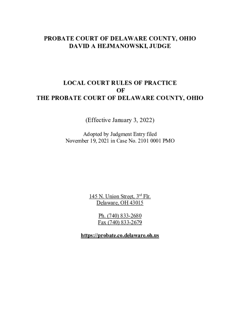 PROBATE COURT OF DELAWARE COUNTY, OHIO DAVID A HEJMANOWSKI, JUDGELOCAL COURT RULES OF PRACTICE OF THE PROBATE COURT OF DELAWARE COUNTY, OHIO (Effective January 3, 2022) Adopted by Judgment Entry filed