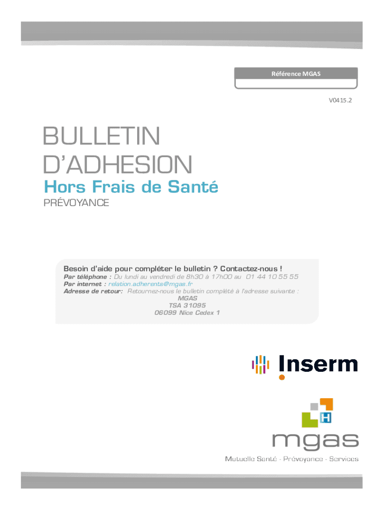 French MGASV0415.2BULLETIN DADHESIONHors Fries de Sent PRVOYANCEBesoin died pour computer LE bulletin ? Contacteznous ! Par phone : Du Lundy AU vended de 8h30 17h00 AU 01 44 10 55 55 Par internet