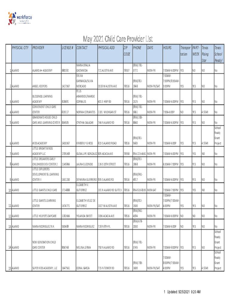 May 2021 Child Care Provider List PHYSICAL CITYPROVIDERLICENSE #1 ALAMOALAMO A+ ACADEMY8801922 ALAMOANGEL KEEPERS14173673 ALAMO 4 ALAMO 5 ALAMO6 ALAMOPHONEDAYSHOURS78537(956) 7813772MONFRINONONo1028