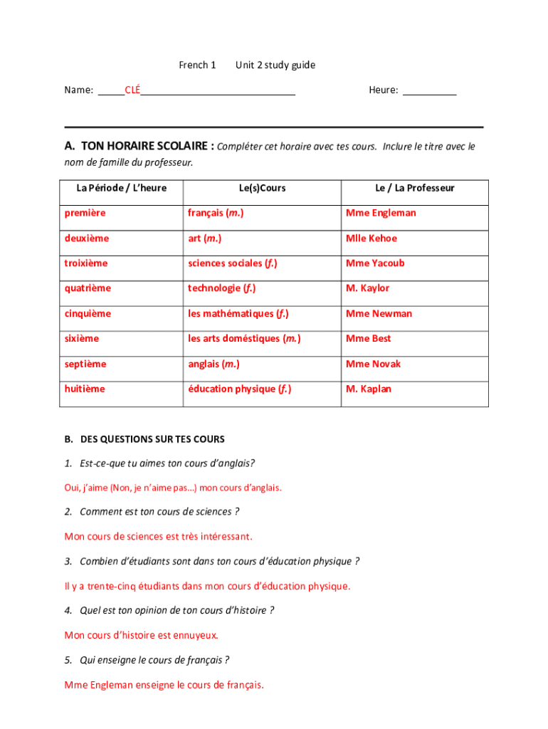 French 1Unit 2 study guidance: ___CL___Heure: ___A. TON HORA IRE CLAIRE : Computer CET hora ire Alec TES course. Include LE title Alec LE not DE Camille Du professor. La Pride / Laurel(s)Course /