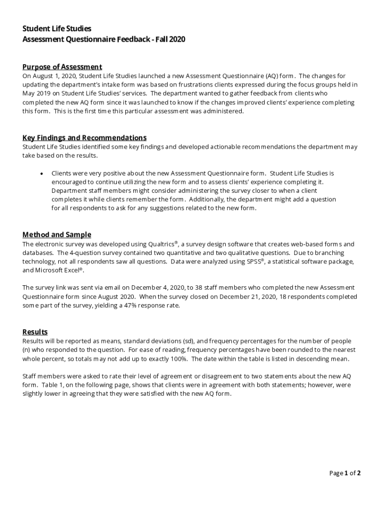 Student Life Studies Assessment Questionnaire Feedback Fall 2020 Purpose of Assessment On August 1, 2020, Student Life Studies launched a new Assessment Questionnaire (A) form. The changes for updating