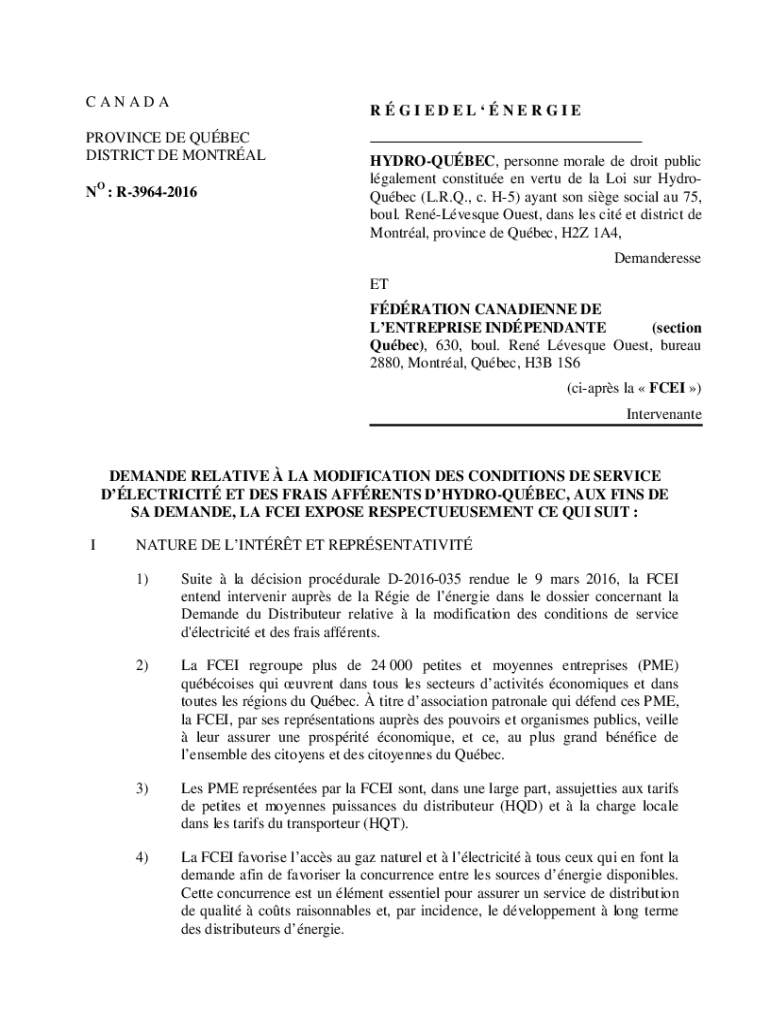 CANADARGIEDELNERGIEPROVINCE DE QUEBEC DISTRICT DE MONTREAL NO : R39642016HYDROQUBEC, personnel morale DE droid public regalement constitute en vert DE la LOI SUR HydroQubec (L.R.Q., c. H₅) plant