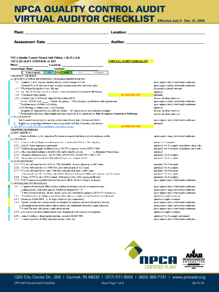 NPC QUALITY CONTROL AUDIT VIRTUAL AUDITOR CHECKLISTEffective July 6 Dec. 31, 2020Plant: ___ Location: ___ Assessment Date: ___ Auditor: ___1320 City Center Dr., 200 I Carmel, IN 46032 I (317) 5719500