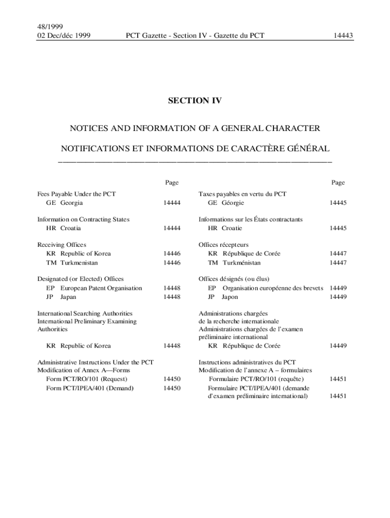 48/1999 02 Dec/DC 1999PCT Gazette Section IV Gazette du PCT14443SECTION IV NOTICES AND INFORMATION OF A GENERAL CHARACTER NOTIFICATIONS ET Information DE CHARACTER GENERAL ___ Page 14444Taxes payables