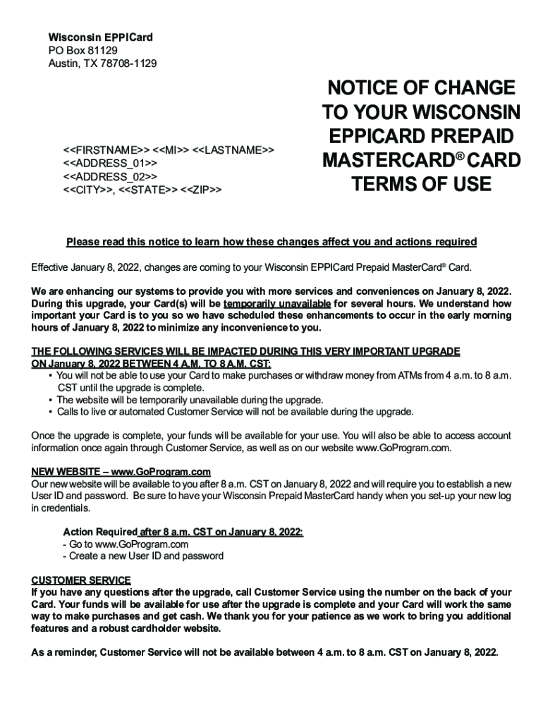 Wisconsin Picard PO Box 81129 Austin, TX 787081129FIRSTNAME MI HOSTNAME ADDRESS_01 ADDRESS_02 CITY, STATE NOTICE OF CHANGE TO YOUR WISCONSIN PICARD PREPAID MASTERCARD CARD TERMS OF Release read this