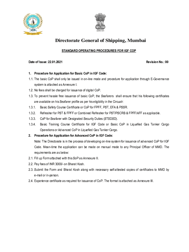 Directorate General of Shipping, Mumbai STANDARD OPERATING PROCEDURES FOR IGF COP Date of Issue: 22.01.2021Revision No.: 001. Procedure for Application for Basic CoP in IGF Code: 1.1. The basic CoP