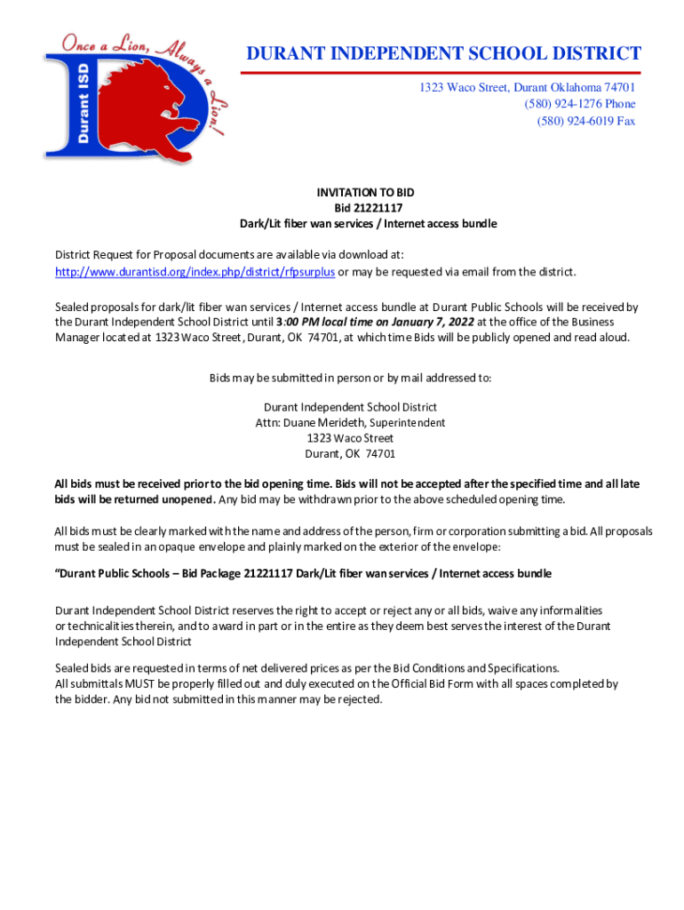 DURANT INDEPENDENT SCHOOL DISTRICT 1323 Waco Street, Durant Oklahoma 74701 (580) 9241276 Phone (580) 9246019 Invitation TO BID 21221117 Dark/Lit fiber wan services / Internet access bundle District