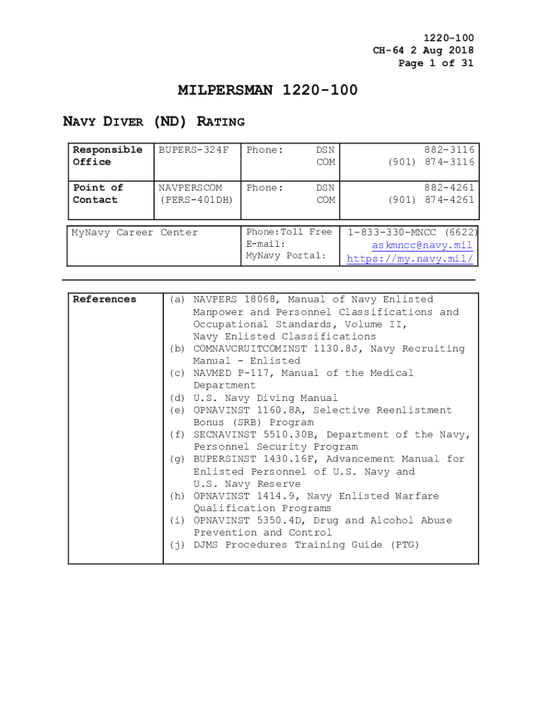 1220100 CH64 2 Aug 2018-Page 1 of 31MILPERSMAN 1220100 NAVY DIVER (ND) RATING Responsible OfficeBUPERS324FPhone:DSN COM8823116 (901) 8743116Point of ContactNAVPERSCOM (PERS401DH)Phone:DSN COM8824261