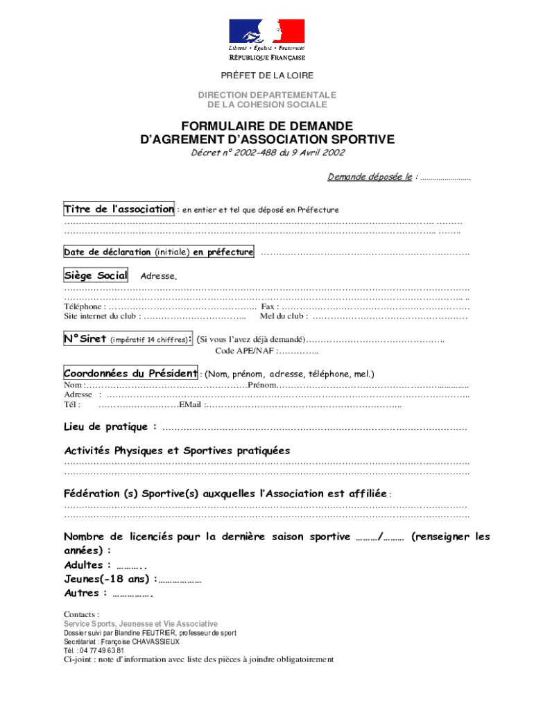 PR FET DE LA LOIRE DIRECTION DEPARTMENTAL DE LA COHESION SOCIALEFORMULAIRE DE DEMAND AGREEMENT ASSOCIATION SPORTIVE Crew n 2002488 Du 9 April 2002 Demanded pose LE :. Title DE association : en entire