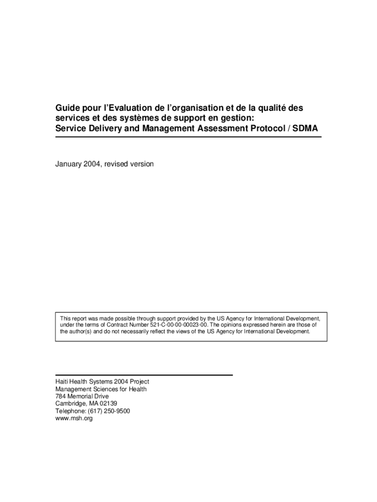 Guide to pour evaluation DE organization et de la quality DES services et DES systems DE support en section: Service Delivery and Management Assessment Protocol / SDMAJanuary 2004, revised versions