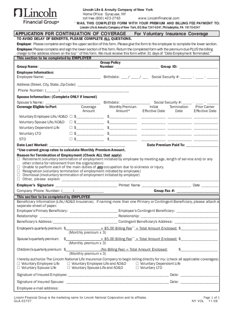 Lincoln Life & Annuity Company of New York Home Office: Syracuse, NY toll-free (800) 4232765 www.LincolnFinancial.com ** MAIL THIS COMPLETED FORM WITH YOUR PREMIUM AND BILLING FEE PAYMENT TO: Lincoln