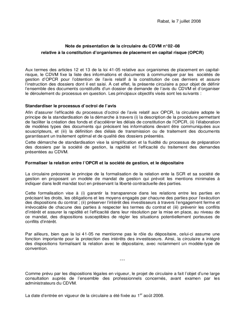 Rabat, LE 7 bullet 2008Note de presentation DE la circular Du CDV n 02 08 relative la constitution organisms DE placement en capital risqué (OCR)Aux terms DES articles 12 ET 13 DE la LOI 4105 relative