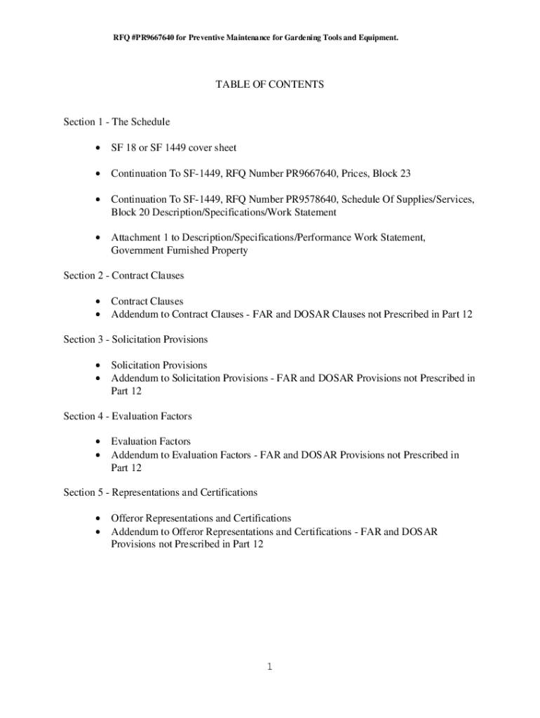 RFQ #PR9667640 for Preventive Maintenance for Gardening Tools and Equipment. TABLE OF CONTENTSSection 1 The Schedule SF 18 or SF 1449 cover sheetContinuation To SF1449, RFQ Number PR9667640, Prices,