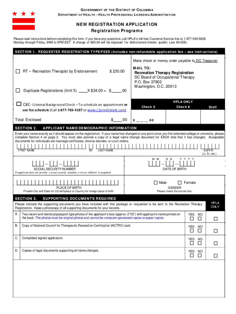 GOVERNMENT OF THE DISTRICT OF COLUMBIA DEPARTMENT OF HEALTH, HEALTH PROFESSIONAL LICENSING ADMINISTRATION REGISTRATION APPLICATION Registration Programs Please read instructions before completing