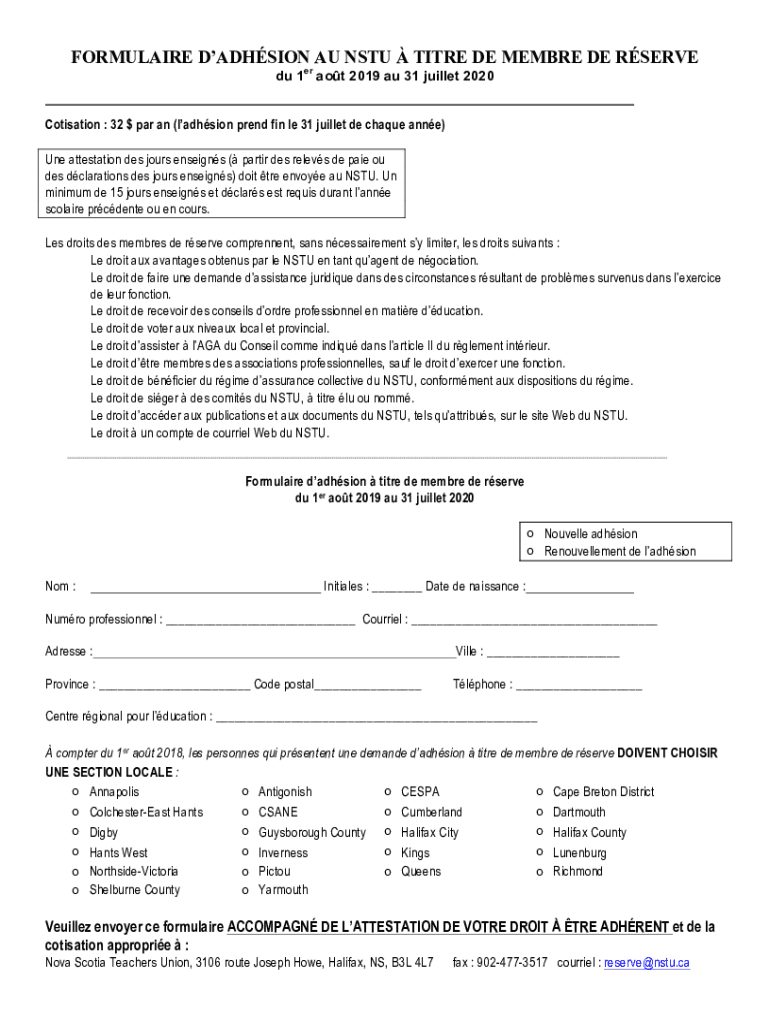 FORMULA IRE ADHESION AU NATU TITLE DE MEMBER DE SERVE Du 1er AOT 2019 au 31 bullet 2020Cotisation : $32 par a (adhesion trend fin LE 31 bullet DE claque Anne) One attestation DES hours ensigns (part