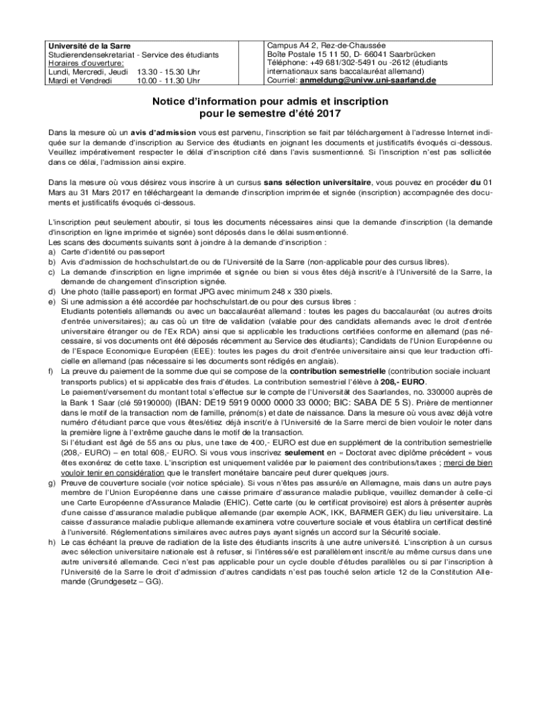 Get the free Notice dinformation pour admis et inscription pour le ...