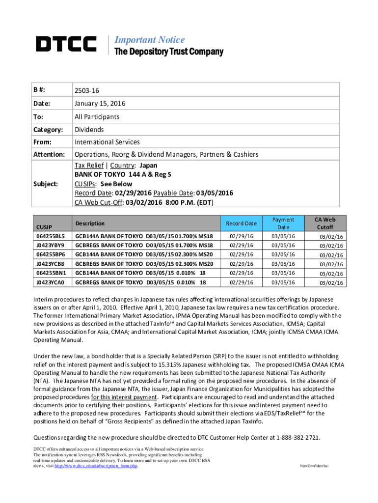 Important Notice The Depository Trust Company #:250316Date:January 15, 2016To:All ParticipantsCategory:DividendsFrom:International ServicesAttention:Operations, Reorg & Dividend Managers, Partners