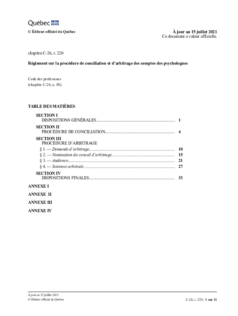 Diver official Du Qubec0 7 four Au 15 bullet 2021 Ce document a valuer officially. Chapter C26, r. 220 Element SUR la procedure DE conciliation ET arbitrage DES competes DES psychologies P S Code