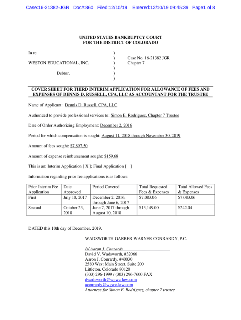 Case:1621382JGR Doc#:860 Filed:12/10/19Entered:12/10/19 09:45:39 Page1 of 8UNITED STATES BANKRUPTCY COURT FOR THE DISTRICT OF COLORADO In re:))))))WESTON EDUCATIONAL, INC. Debtor. Case No. 1621382