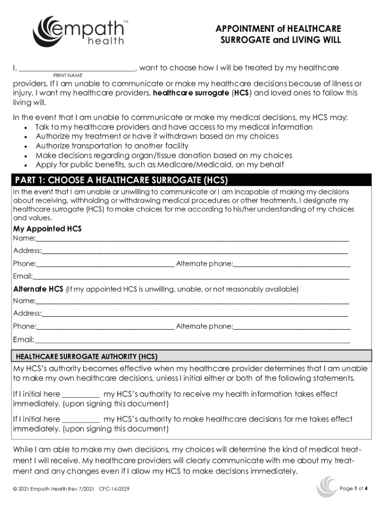 APPOINTMENT of HEALTHCARE SURROGATE and LIVING WILL I, ___, want to choose how I will be treated by my healthcare PRINT NAME providers. If I am unable to communicate or make my healthcare decisions
