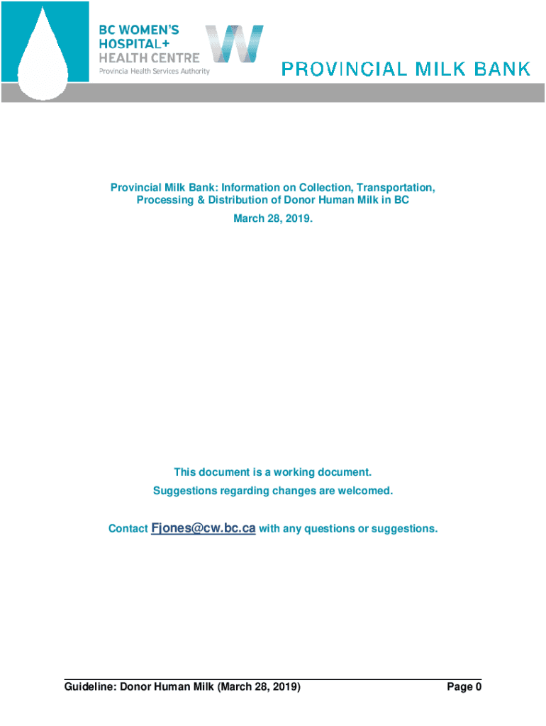 Provincial Milk Bank: Information on Collection, Transportation, Processing & Distribution of Donor Human Milk in BC March 28, 2019. This document is a working document. Suggestions regarding changes