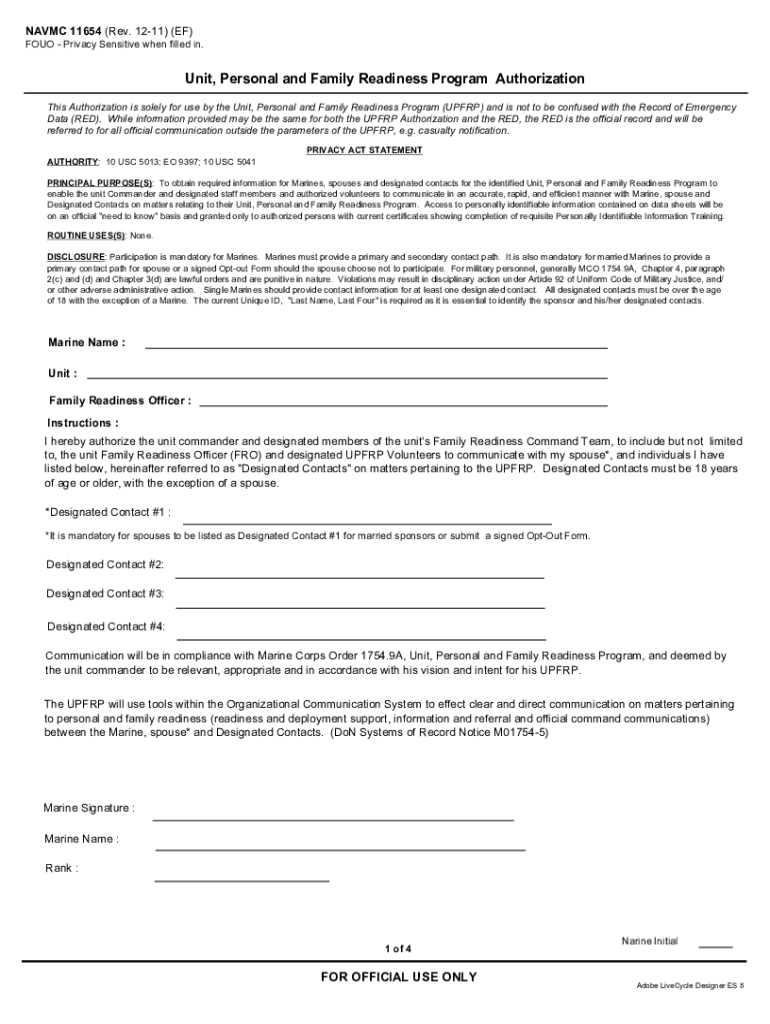 NAMC 11654 (Rev. 1211) (EF)Print Formosa Privacy Sensitive when filled in. Unit, Personal and Family Readiness Program Authorization This Authorization is solely for use by the Unit, Personal and