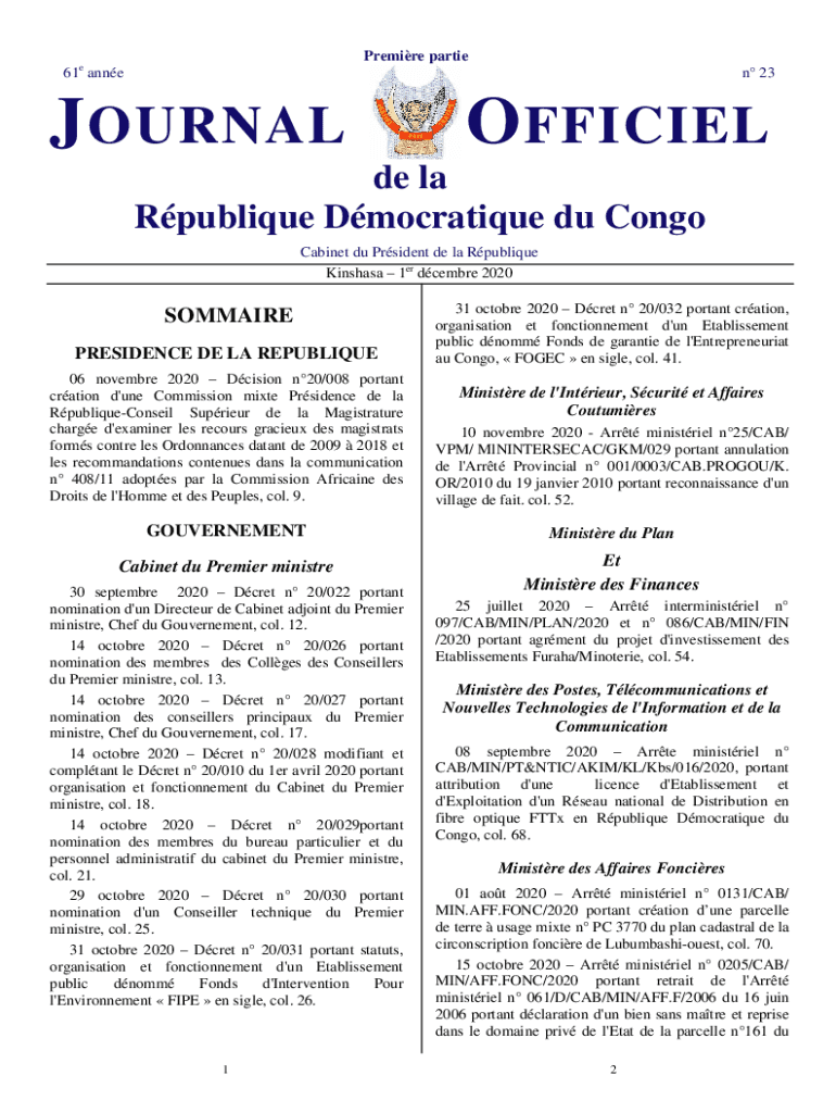 Premiere parties 61e Anne 23J JOURNAL FFICIELde la Oblique Democratize Du Congo Cabinet du President de la Oblique Kinshasa 1er December 2020SOMMAIRE RESIDENCE DE LA REPUBLIQUE31 October 2020 Crew