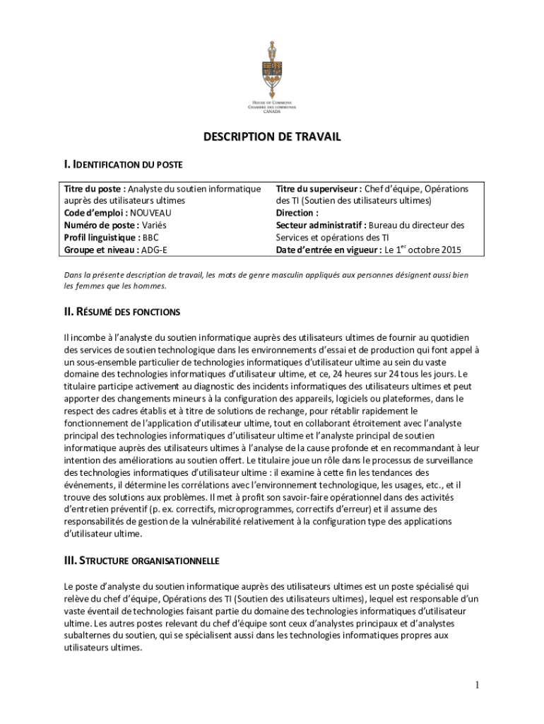 DESCRIPTION DE TRAVAIL I. IDENTIFICATION DU POST Title Du post : Analyst Du southern informative APRS DES utilisateurs uptimes Code employ : Nouméa Humor DE post : Paris Profit linguistic : BBC Group