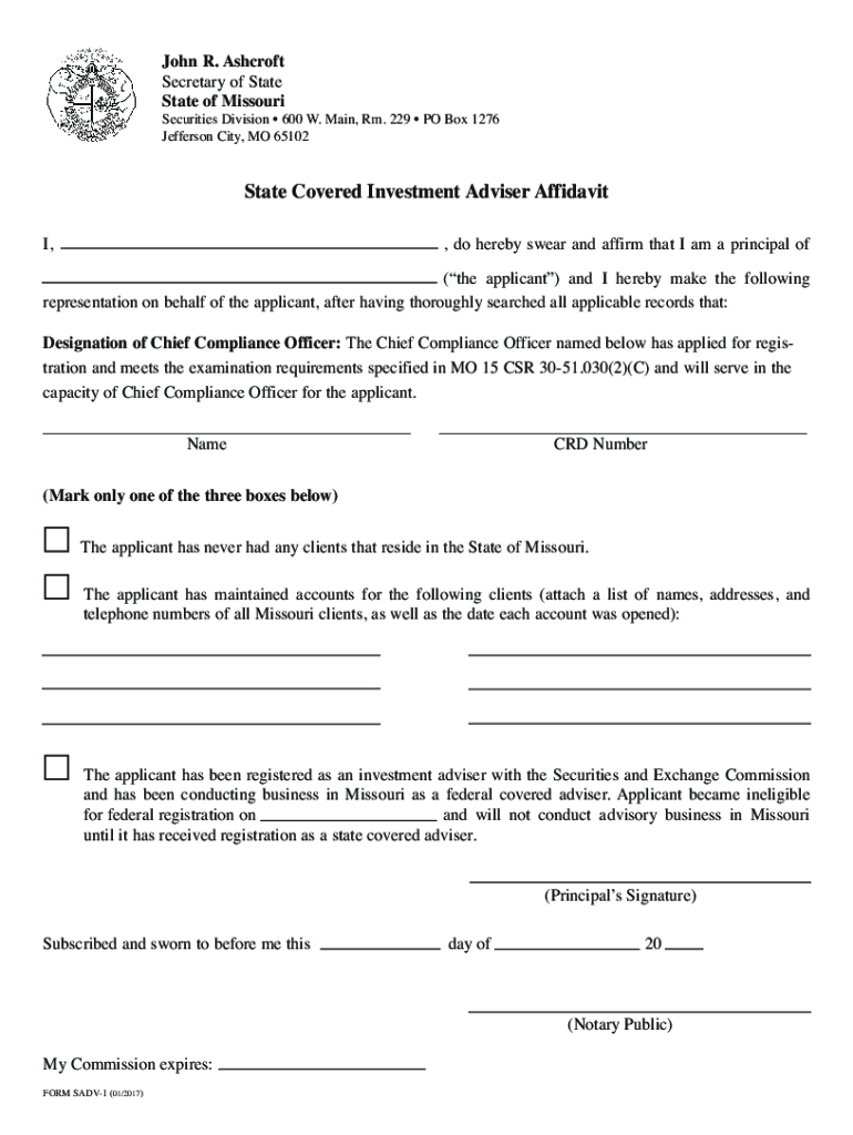John R. Ashcroft Secretary of State of Missourians form is designed to be filled out online for your convenience. PrintResetSecurities Division 600 W. Main, Rm. 229 PO Box 1276 Jefferson City, MO