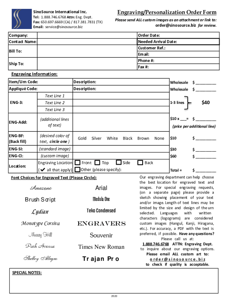 Engraving/Personalization Order FormSinoSource International Inc. Tel: 1.888.746.6768 Attn: Eng. Dept. Fax: 650.697.6669 (CA) / 817.381.7831 (TX) Email: service@sinosource.bizPlease send ALL custom