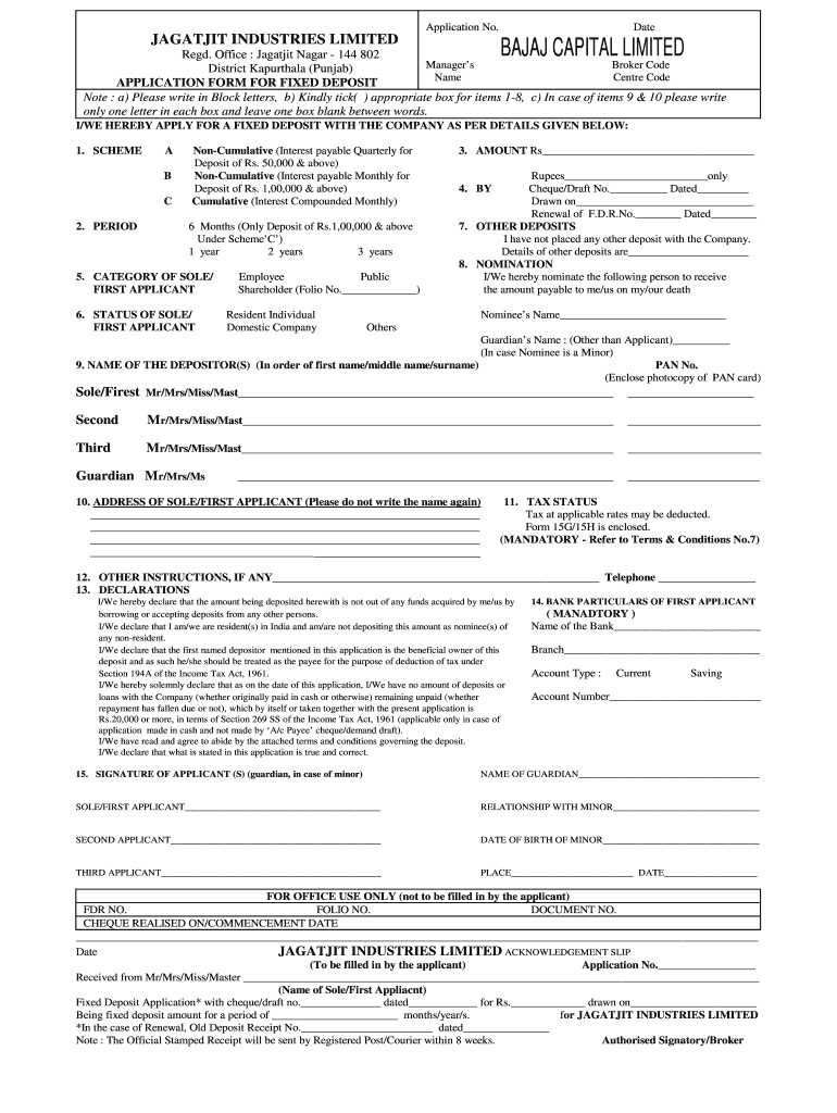 Application No. JAGATJIT INDUSTRIES LIMITED Date BAJAJ CAPITAL LIMITED Red. Office : Jagatjit Nagar 144 802 Managers Broker Code District Kapurthala (Punjab) Name Center Code APPLICATION FORM FOR