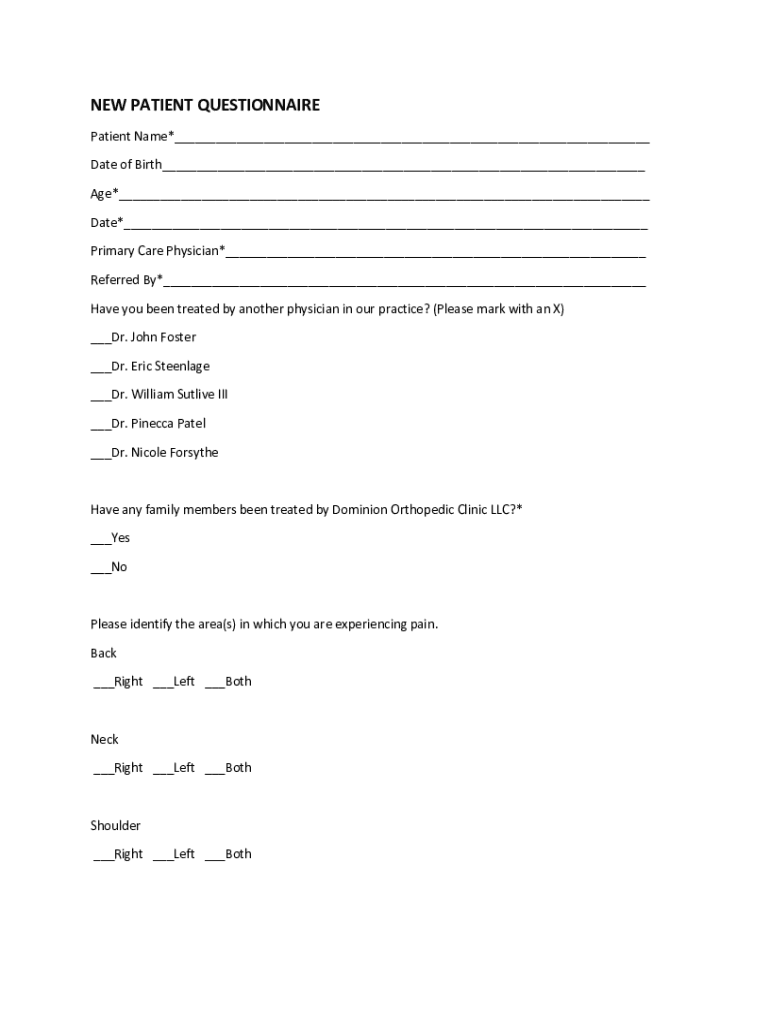 NEW PATIENT QUESTIONNAIRE Patient Name*___ Date of Birth___ Age*___ Date*___ Primary Care Physician*___ Referred By*___ Have you been treated by another physician in our practice? (Please mark with