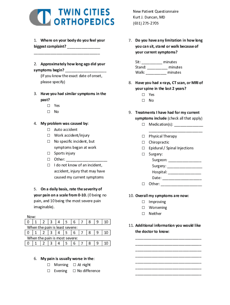 New Patient Questionnaire Kurt J. Duncan, MD (651) 27527051. Where on your body do you feel your biggest complaint? ___ ___ 2. Approximately how long ago did your symptoms begin? ___ (If you know