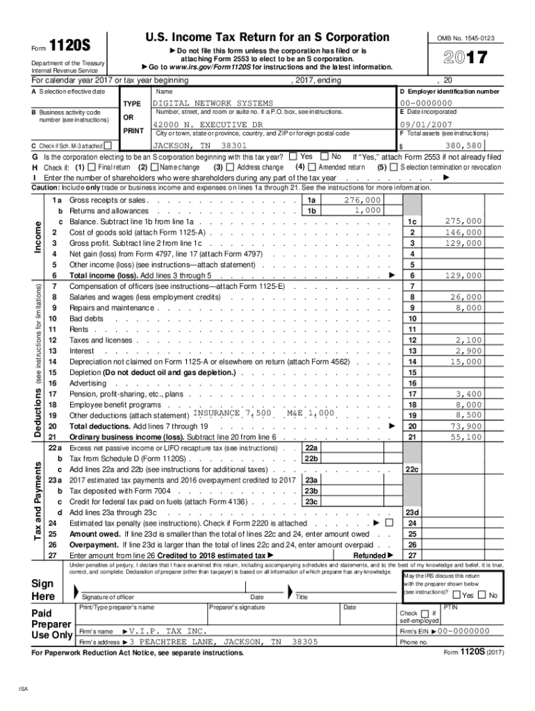 Form. S. Income Tax Return for an S Corporation1120SDepartment of the Treasury Internal Revenue ServiceNow calendar year 2017 or tax year beginning A S election effective date2017, 2017, ending, 20NameTYPE
