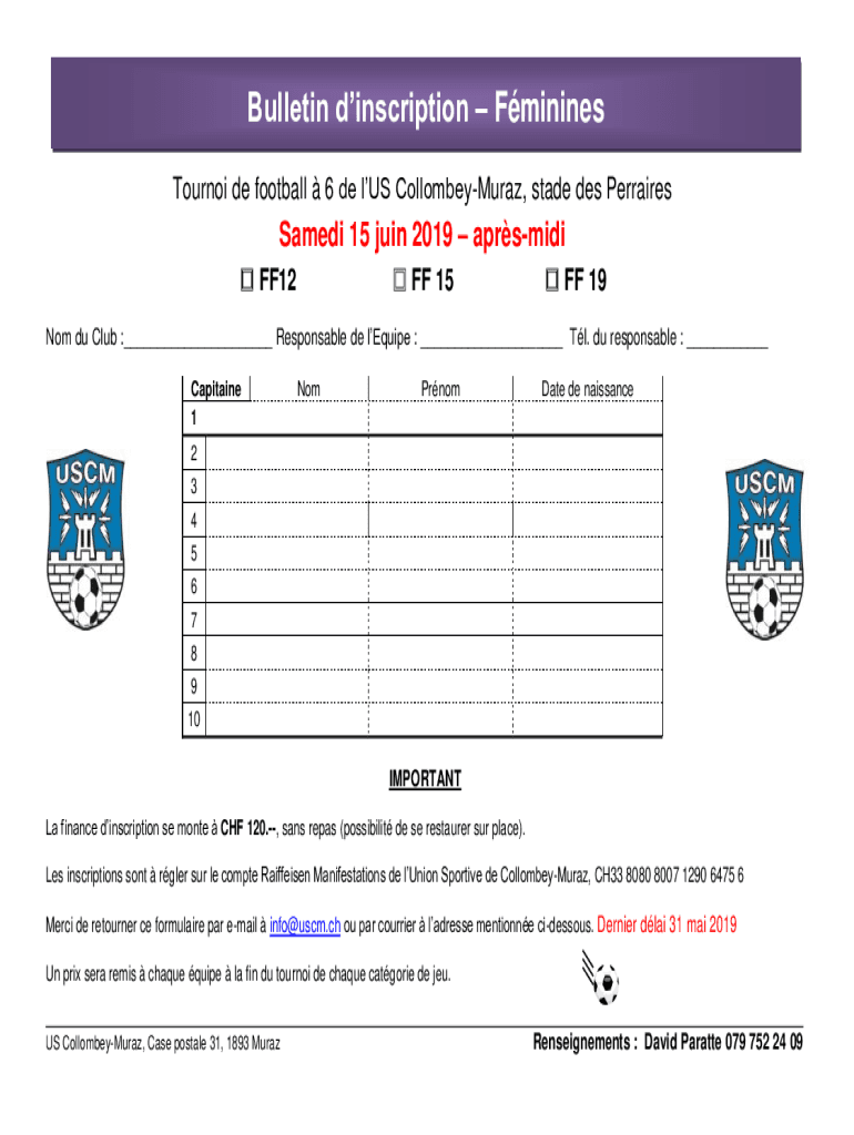 Bulletin inscription Feminines Tourney DE football 6 DE us CollombeyMuraz, state DES PerrairesSamedi 15 join 2019 aprsmidi FF12 FF 15 FF 19Nom Du Club :___ Responsible DE require : ___ Tl. Du responsible