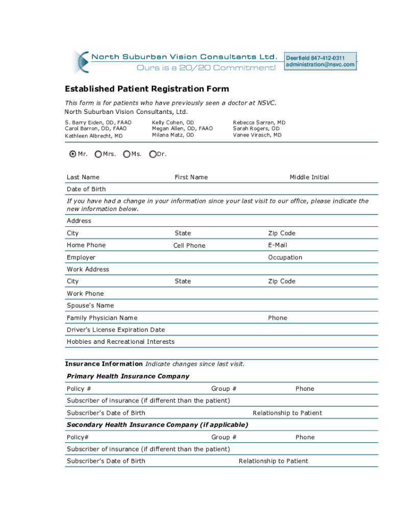 Deerfield 8474120311 administration@nsvc.comEstablished Patient Registration Form This form is for patients who have previously seen a doctor at SVC. North Suburban Vision Consultants, Ltd. S. Barry