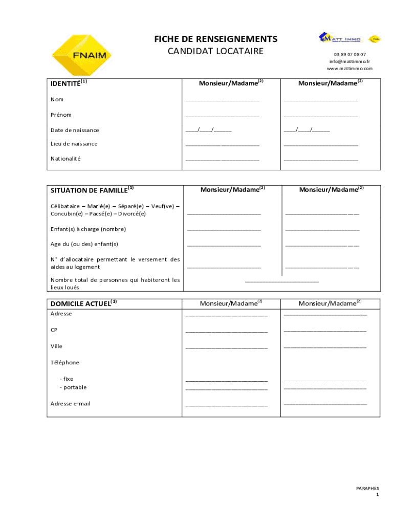 Information such as personal details, contact information, employment status, income sources, rental history, and references must be reported on the wwwmattimmocom pdf candidature-location-fnaimfiche de.