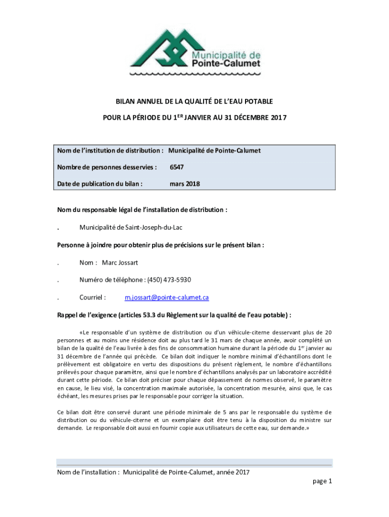 Get the free Bilan annuel de la qualit de l eau potable pour la ...