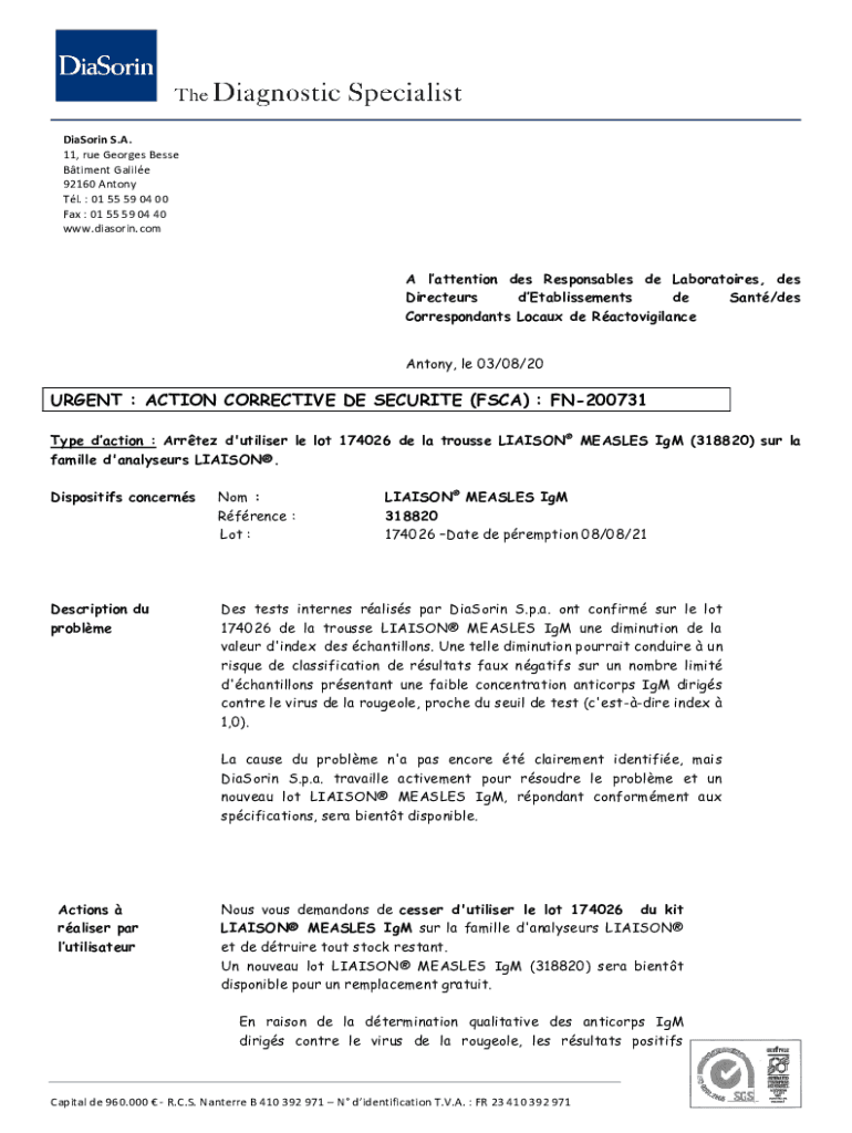 Diaspora S.A. 11, rue Georges Jesse Raiment Galilee 92160 Antony Tl. 01 55 59 04 00 Fax : 01 55 59 04 40 www.diasorin.comA attention DES Responsible de Laboratoires, DES Directors dEtablissements
