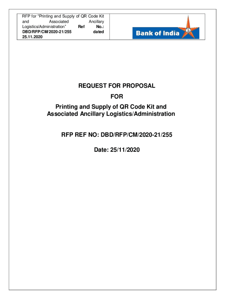 RFP for Printing and Supply of QR Code Kit and Associated Ancillary Logistics/Administration Ref No.: DBD/RFP/CM/202021/255 dated 25.11.2020REQUEST FOR PROPOSAL FOR Printing and Supply of QR Code
